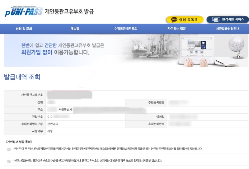 2. 이미 발급한 적이 있으면, 아래와 같이 기존 발급된 개인통관고유부호(개인통관고유번호)를 보여준다.