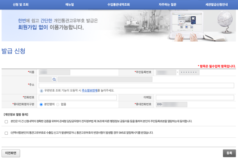 필수적으로 이름과 주민등록번호 주소 전화번호 휴대전화 번호 등을 기재해야 하는데 개인통관고유부호 신청시 주소는 주민등록상의 주소를 기재해야 한다.