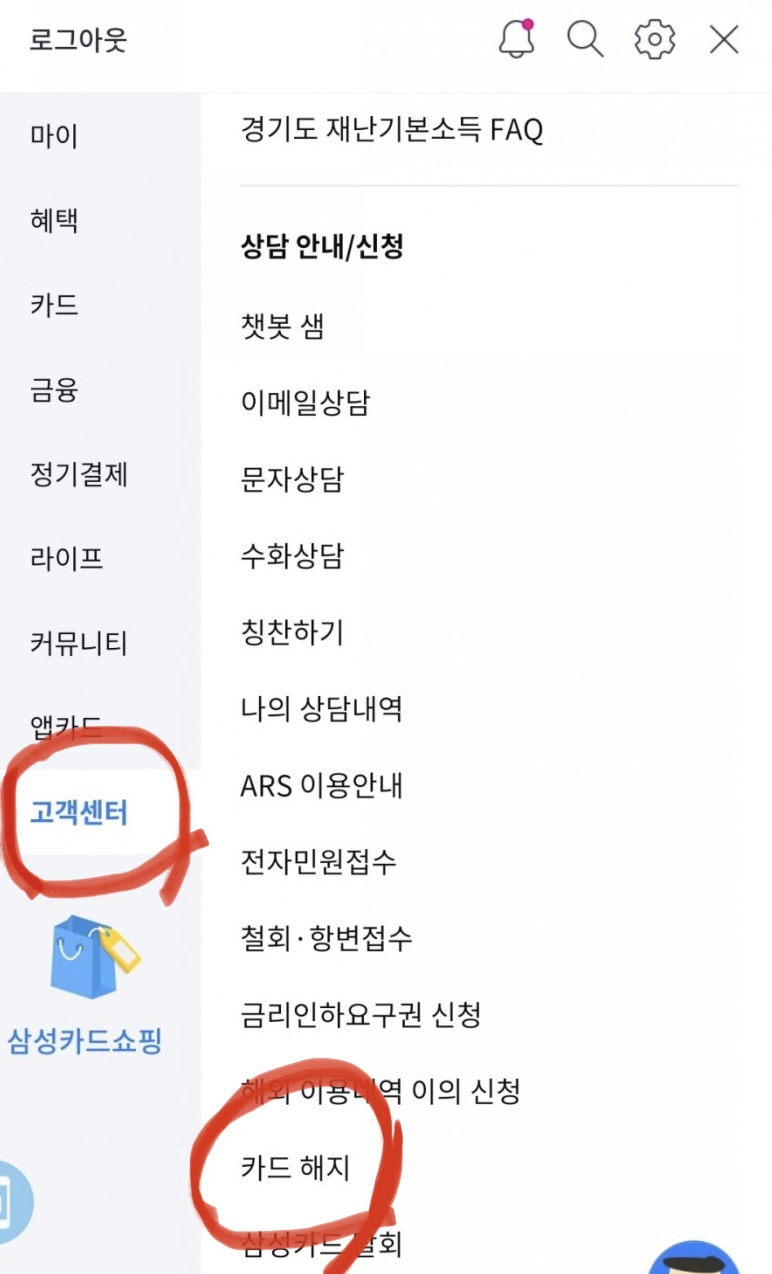 이럴 경우 위의 2번으로 돌아가서 (메뉴 - 고객센터 - 카드해지)