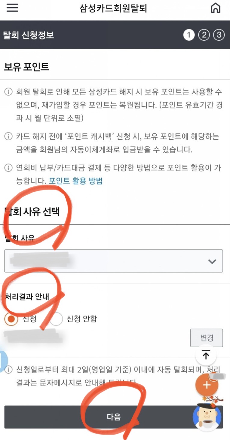 3. 카드해지 신청을 누르고 "보유카드 선택"을 누른 후 "해지사유 선택"을 한 후 맨 하단에 있는 다음 버튼을 선택한다.
