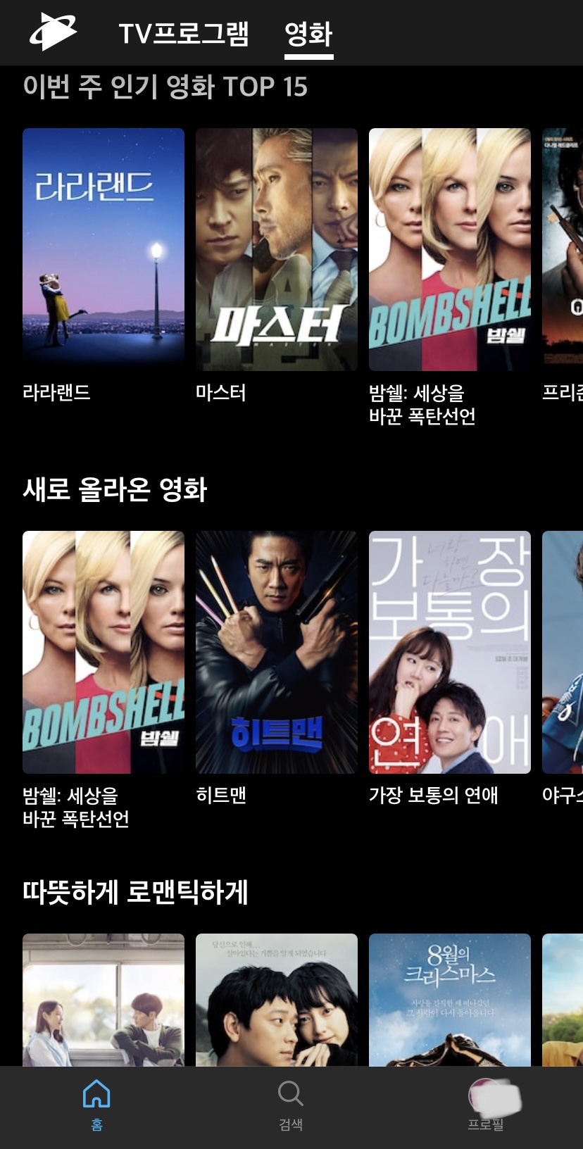 크게 TV 프로그램 탭, 영화 탭이 있는데