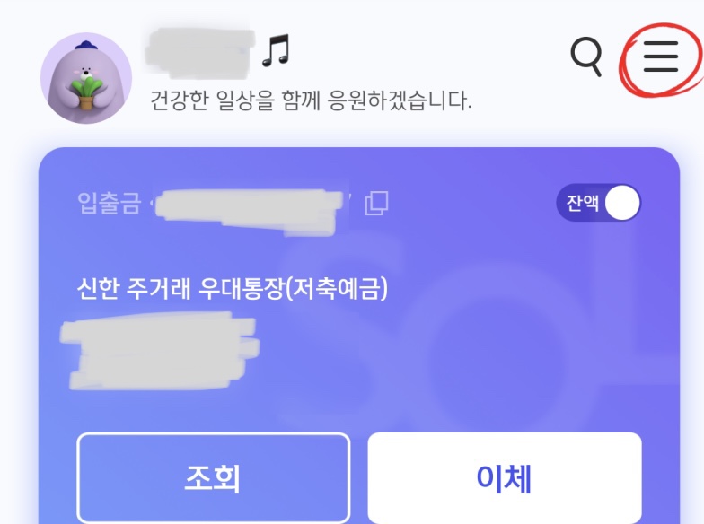 신한쏠 앱 실행 후 우측 상단에 있는 세개의 막대기-더보기 메뉴 버튼을 선택한다.
