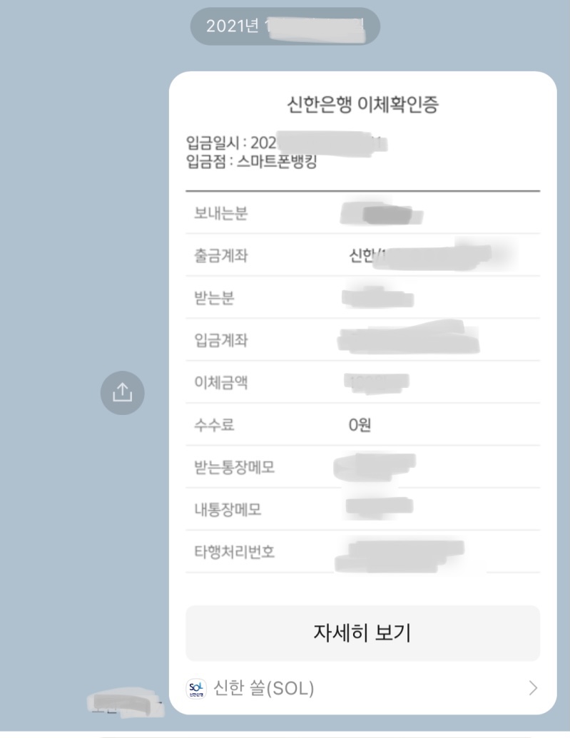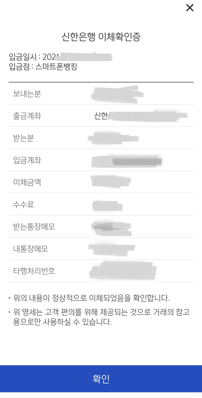 참고로 신한은행 이체확인증 입금확인증 (모바일) 서식은 아래와 같다.
