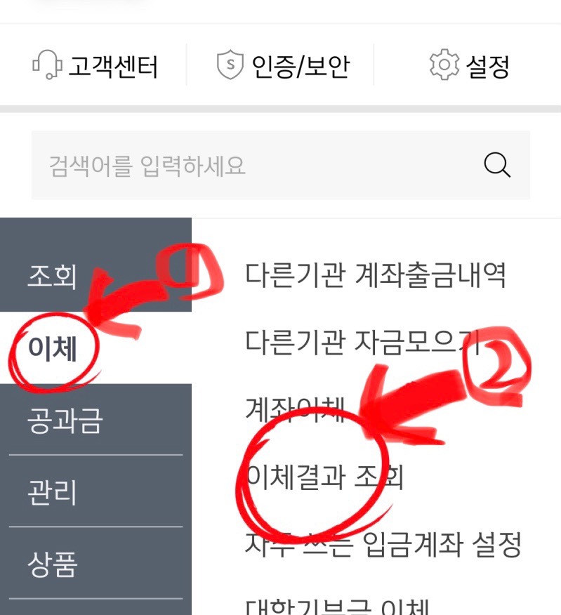 2) 더보기 메뉴 선택 후 아래와 같이 좌측 리스트 중에 "이체" 탭을 선택하면