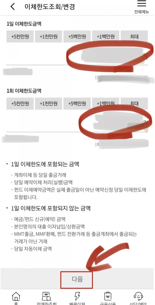 원하는 1일 이체한도금액과 1회 이체한도금액을 입력하고 다음을 선택한다.