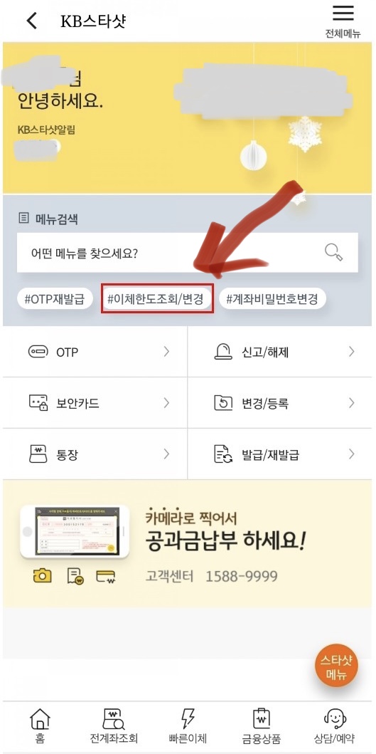 5. 아래와 같이 KB스타샷 메뉴 화면에서 메뉴검색 검색창 하단에 있는 "이체한도조회/변경" 버튼을 눌러준다.