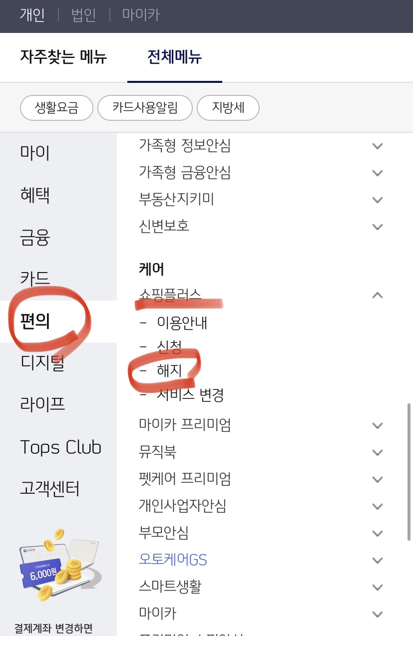참고로 전체 메뉴 검색을 하거나 하면 이상하게 쇼핑 플러스 해지 기능을 찾을 수가 없다.
