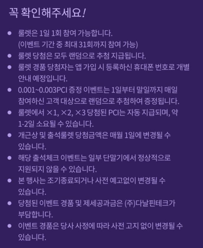 - 0.001~0.003PCI 받을 수 있고 1일부터 말일까지 랜덤으로 추첨하여 증정