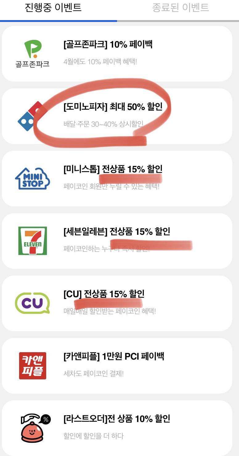 # 추가적으로 출석체크 페이코인 지급 외에도 출석체크 회원 중 랜덤으로 추첨하여 특별상도 지급하고 아래와 같이 다양한 할인 이벤트를 하고 있다. 단순 출석체크 뿐만 아니라 도미노피자 50% 할인 등 페이코인 앱으로 상당히 많은 혜택을 얻을 수 있으니 꼭 확인하기를 추천한다.