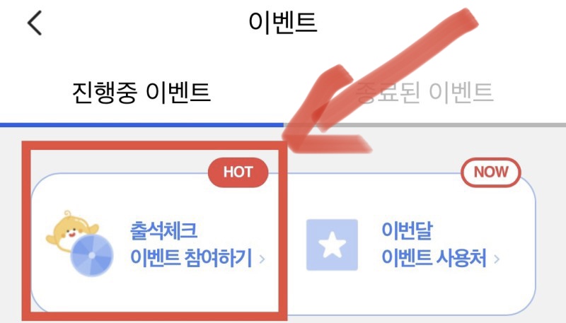 - 진행중 이벤트 아래 왼쪽 상단에 있는 "출석체크 이벤트 참여하기"를 선택하면 된다.