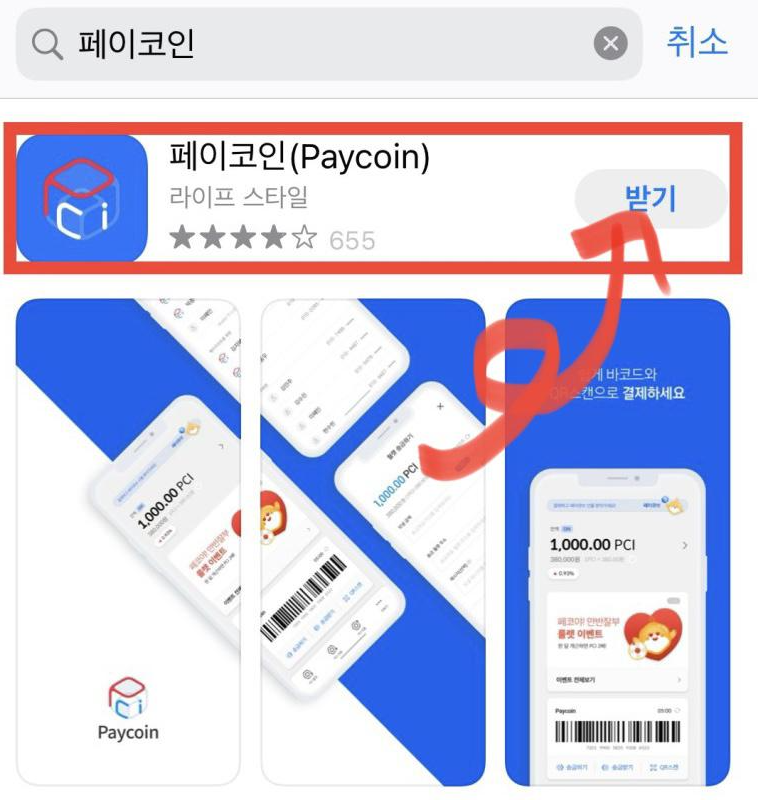 - IOS의 앱스토어나 안드로이드 플랫폼의 구글플레이스토어에서 "페이코인"을 검색해 다운로드 받아서 실행한다.