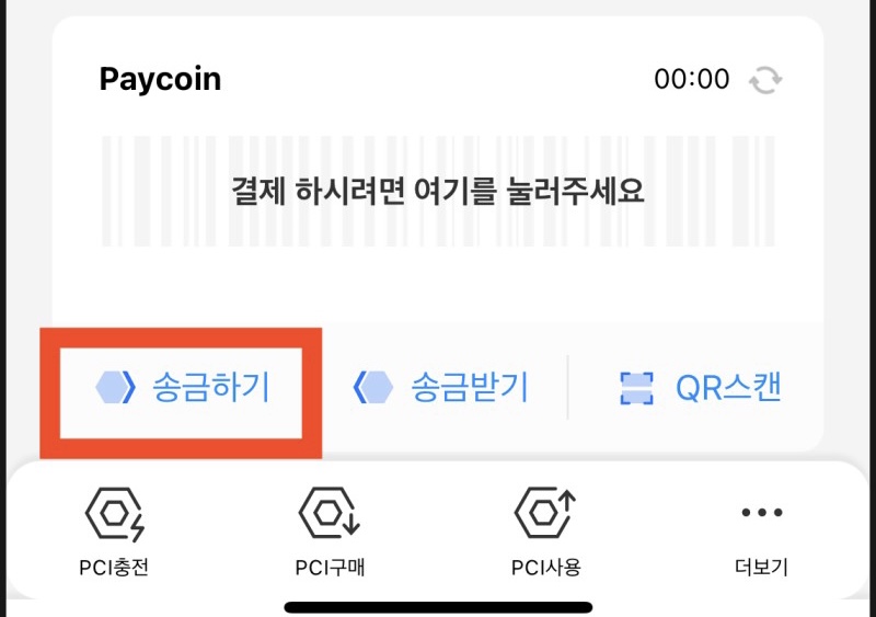 (5) #페이코인# 페이코인앱을 실행하여 하단 "송금하기" 버튼을 선택한다.
