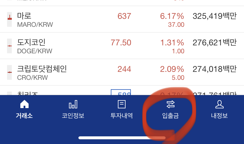 (1) #업비트# 하단 우측 끝에서 두번째 "입출금" 버튼을 선택한다.