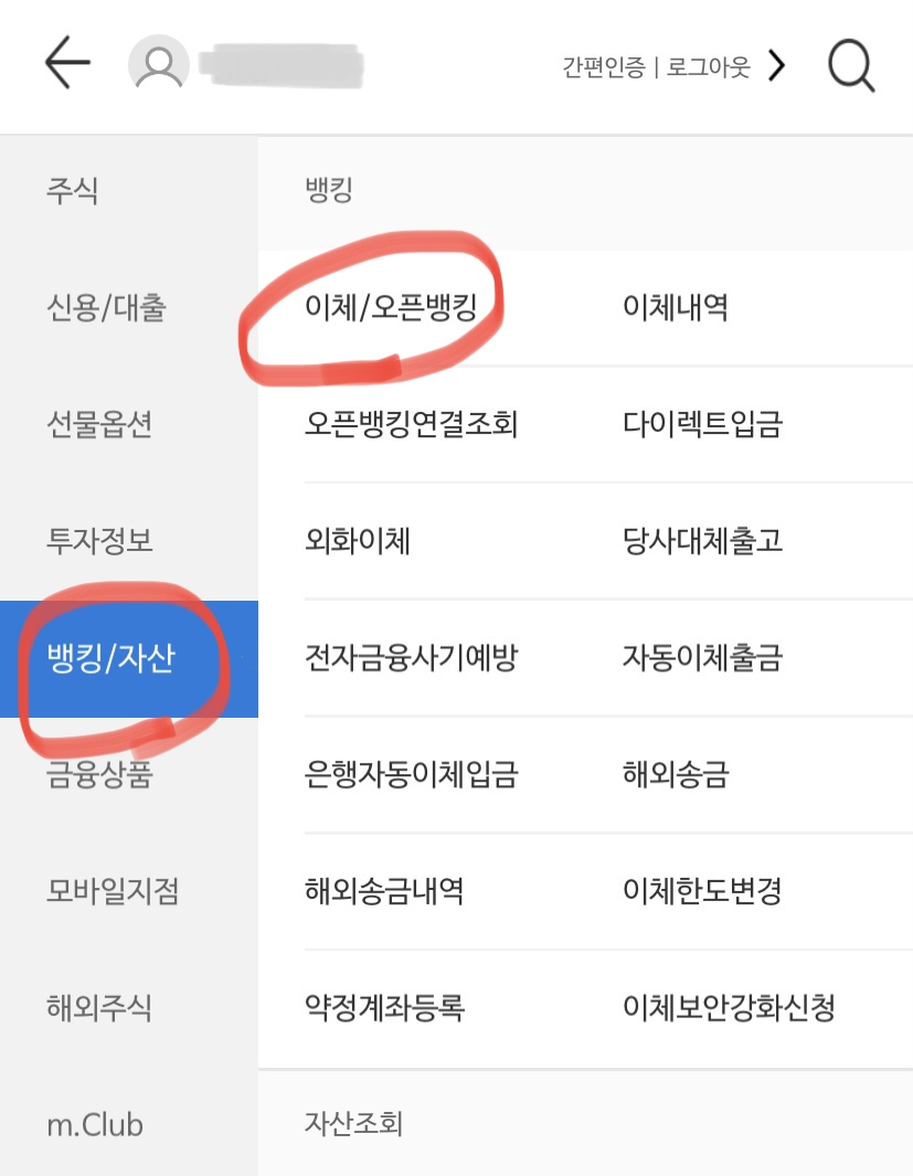 우측에서 "이체/오픈뱅킹"을 선택한다.