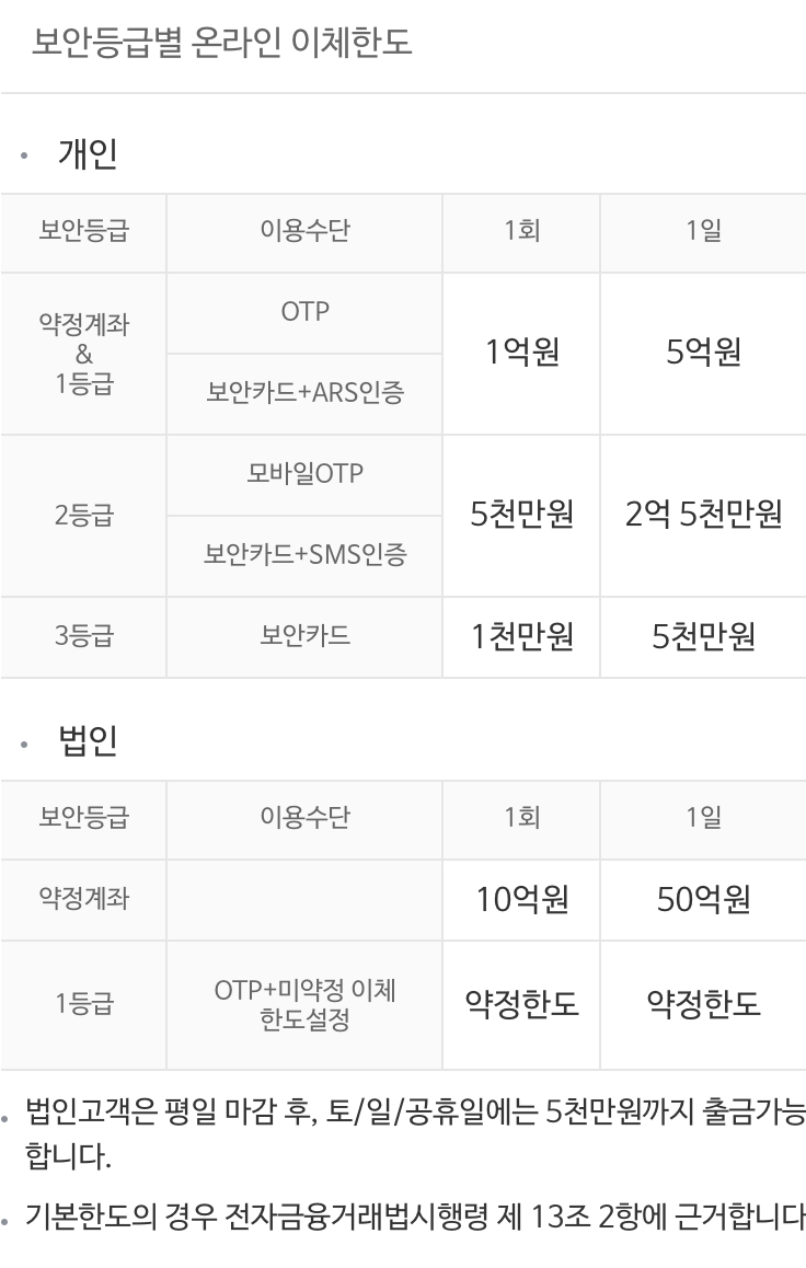 아래와 같이 보안 등급별 온라인 이체한도가 나타난다.