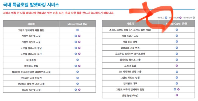 위의 이미지와 같이 마스터카드 월드 등급으로 무료 발렛서비스가 가능한 국내호텔 리스트는 아래와 같다.