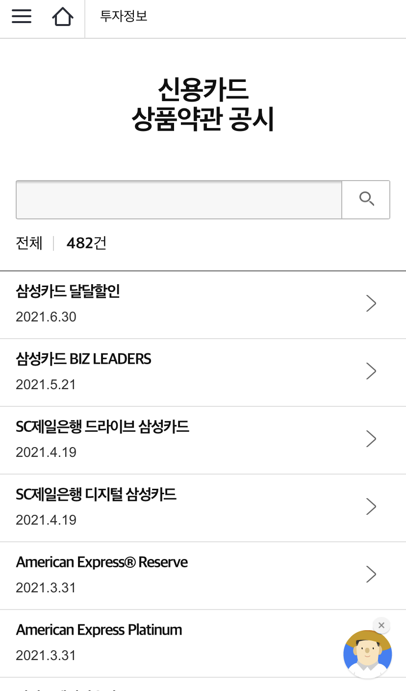신용카드사에서 브랜드별로 "상품공시실" 이라고하는 홈페이지를 필수적으로 운영하는데