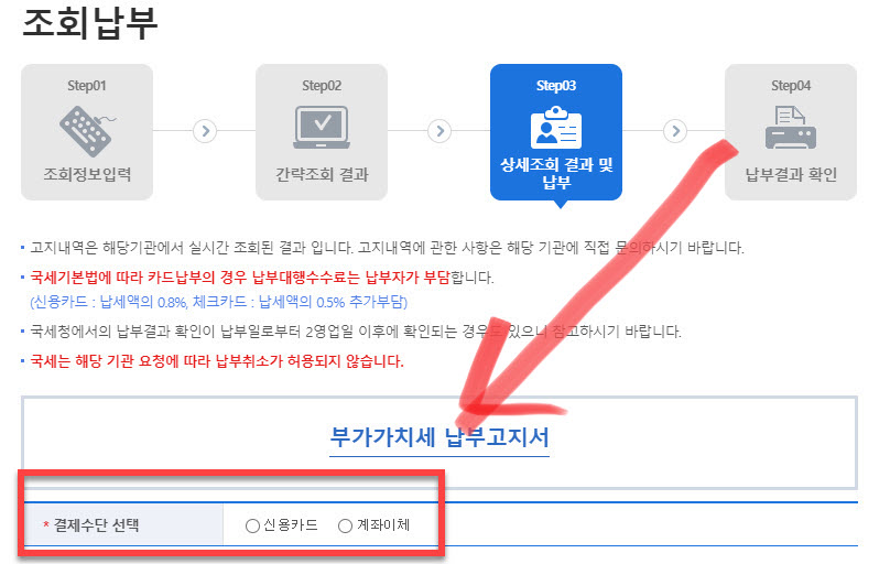 6. 세번째로 부가가치세 납부 고지 금액 납부를 위한 결제 수단을 신용카드와 계좌이체 중에 선택한다.