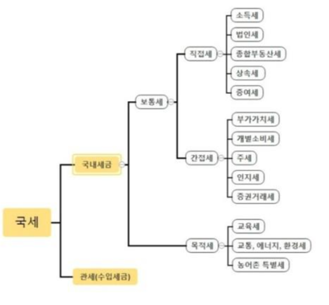 : 국세에는 대표적으로 소득세, 종부세(종합부동산세), 상속세, 증여세, 부가가치세 등이 있다.