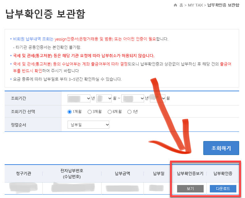 마지막으로 납부확인증을 pdf로 저장하거나 프린트 인쇄하기 위해서는 “납부확인증 보관함” 에서 "다운로드" 버튼을 선택하면 된다.