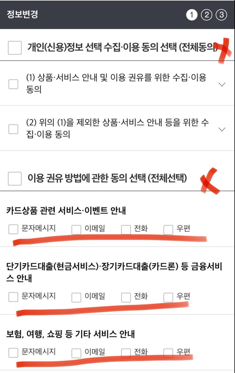 아무런 광고 수신을 원하지 않는다면 꼼꼼하면 모든 항목에 대해 수신해제를 한다.