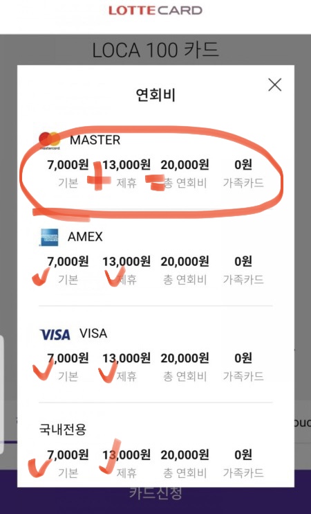 우선 기본연회비 및 제휴연회비에 대해서 정리하자면 아래와 같다.