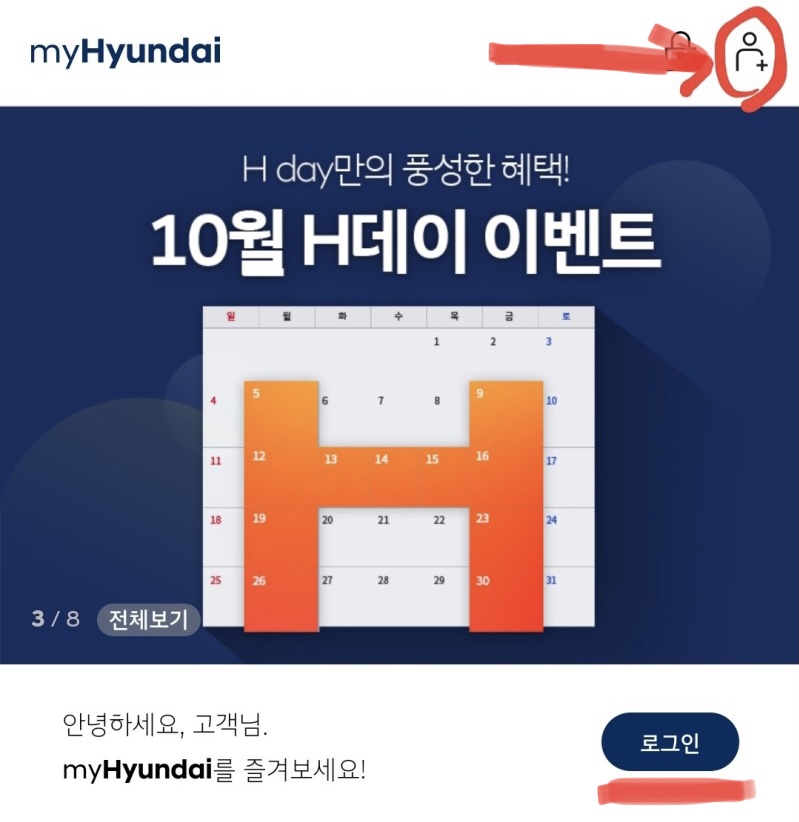 2. 마이현대 앱을 실행한 다음 우측 상단에 나타난 사람 모양과 +표시가 있는 아이콘을 선택한다.