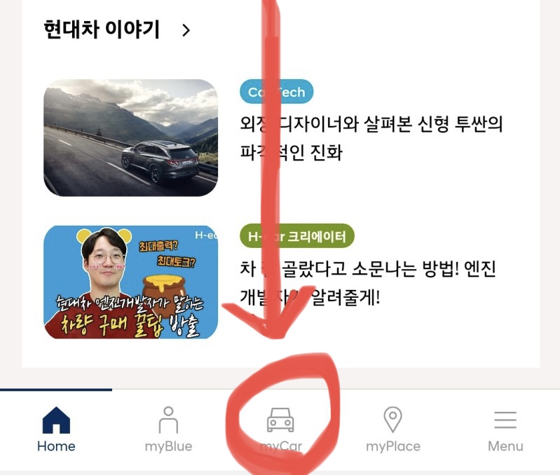 5. 현대차 - 현대자동차 정비이력을 확인하기 위해서는 하단 탭에 있는 "myCar"를 선택해준다.