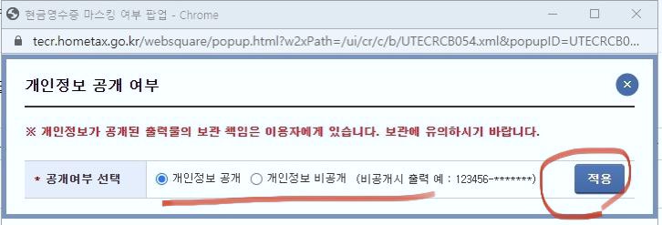 (8) 출력 전에 개인정보 공개 마스킹 여부 팝업창이 뜬다.