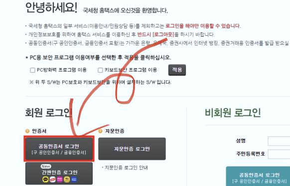 개인사업자 공동인증서로 로그인을 진행해준다.