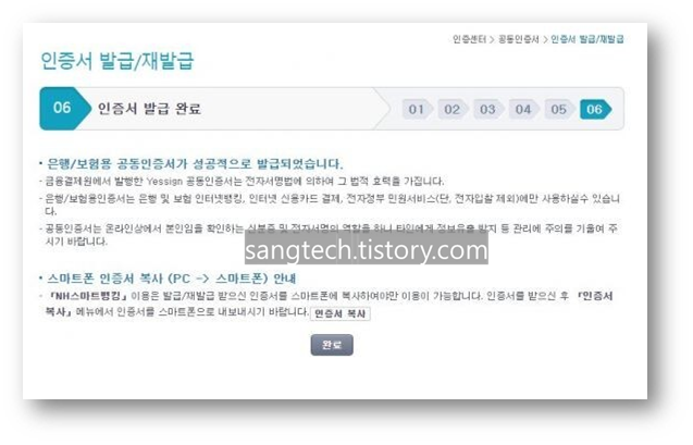 아래와 같이 인증서 발급 완료 화면이 뜬다. 완료 버튼을 누르면 종료되고 안내에 따라 스마트폰 복사를 통해 자녀의 인터넷 뱅킹 또한 모바일 뱅킹으로 쉽게 진행이 가능하다.