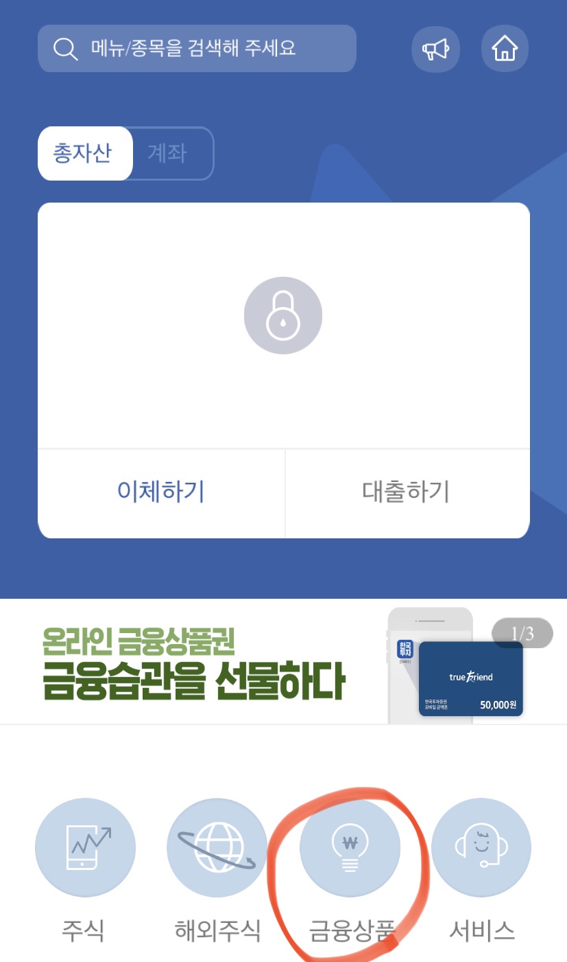 1. "한국투자증권" 앱을 실행시키고 의 첫 화면에서 "금융상품" 선택한다.