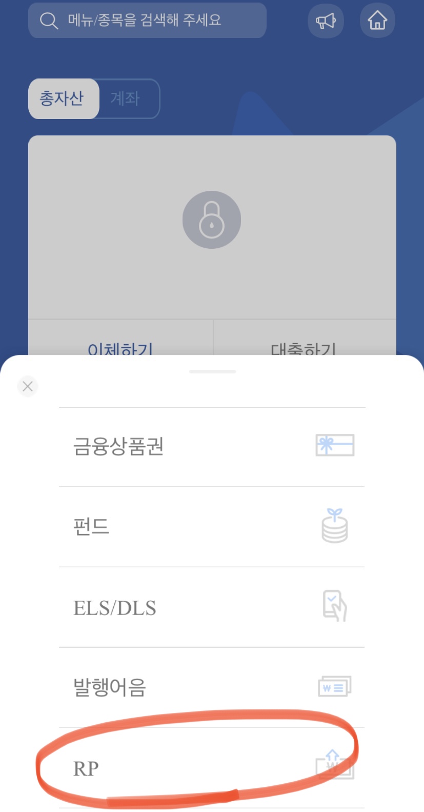 2. 다음 화면에서 나타난 금융상품 리스트 중에서 "RP"를 선택한다.