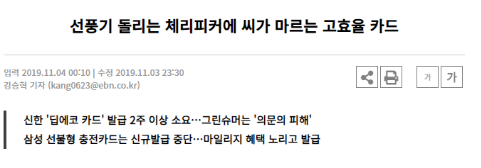 이 기사의 제목만 보면 무슨 말인지 도통 이해가 안된다. 선풍기 돌리는 체리피커에 씨가 마르는 고효율 카드?
