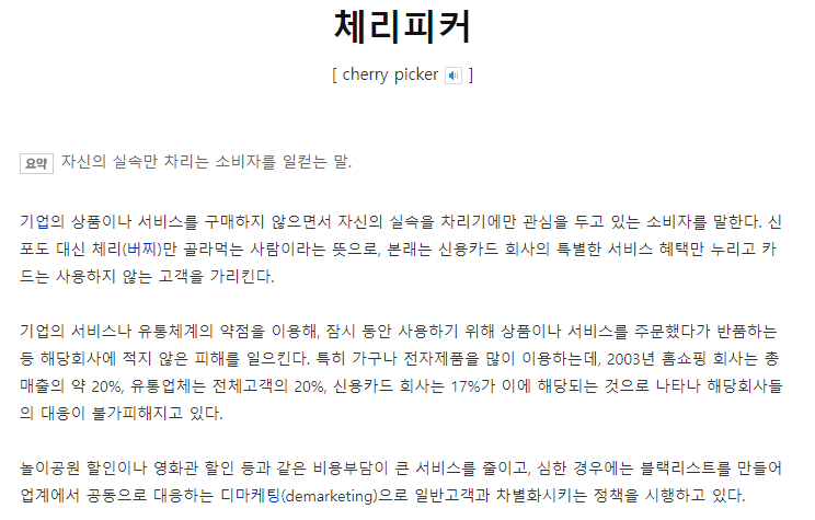: 자신의 실속만 차리는 소비자를 일컫는 말이다. 신포도 대신 체리만 골라먹는 사람이라는 뜻으로 대개는 신용카드 회사의 특별한 서비스 혜택만 누리고 카드는 사용하지 않는 고객을 의미하는 경우가 많은 듯 하다.