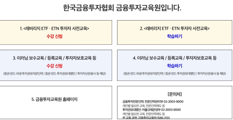 추가적으로 레버리지 ETF ETN 투자자 사전교육을 위한 금융투자교육원 홈페이지는 아래와 같다.