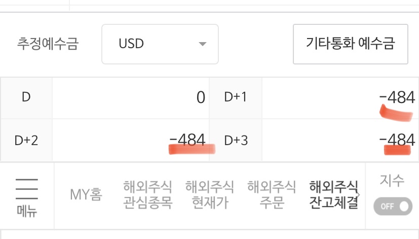 원화 예수금은 그대로인데 USD(미국 달러) 예수금이 마이너스가 뜨는 케이스 같은 건데,