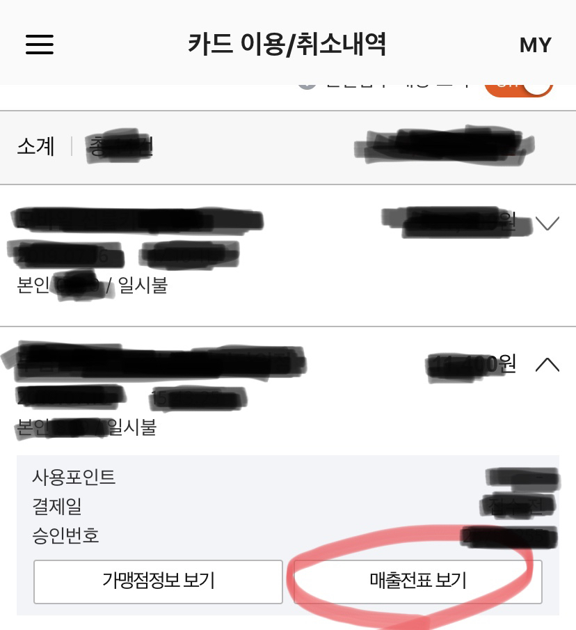 각 카드사 홈페이지나 모바일 앱으로 "매출전표"를 재발급 받으면 된다.