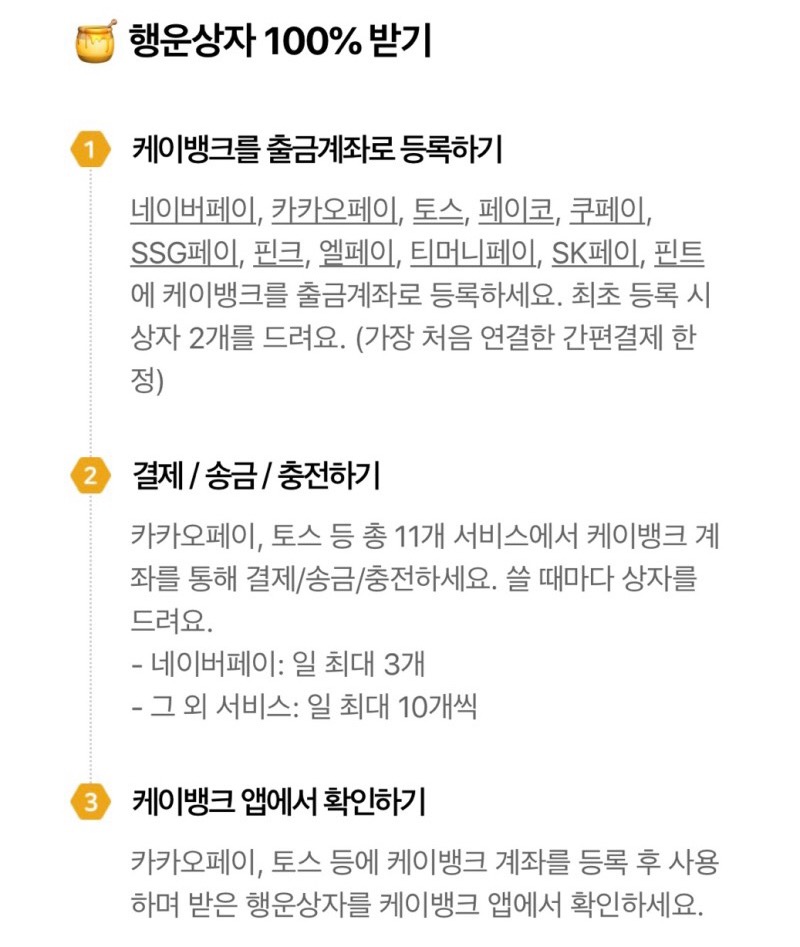 2) 혹시 케이뱅크 가입이 안되어 있으면 아래 링크를 통해 가입하면 100개 행운상자를 받을 수 있다.