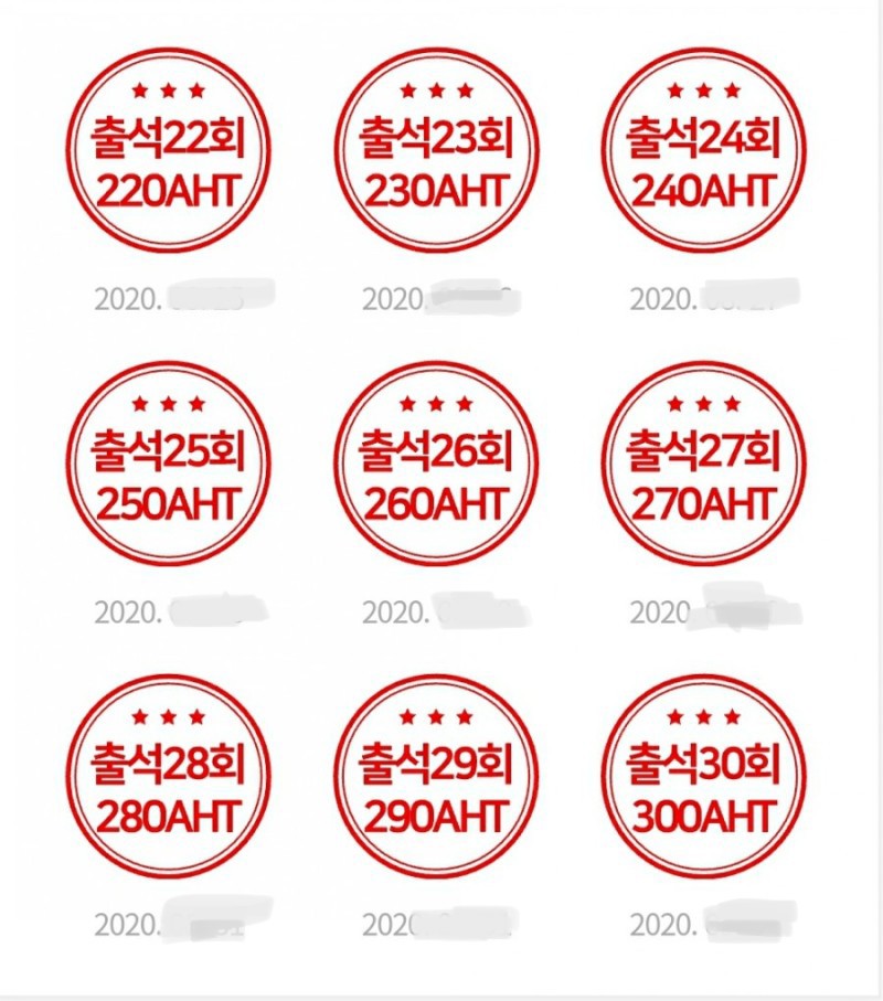 추가적으로 출석체크를 통한 출석 보상은 150일 동안 진행되며 총 23,250 AHT (약 11만 6250원) 획득 가능하다. 아래와 같이 출석 횟수마다 지급 코인이 달라지는데