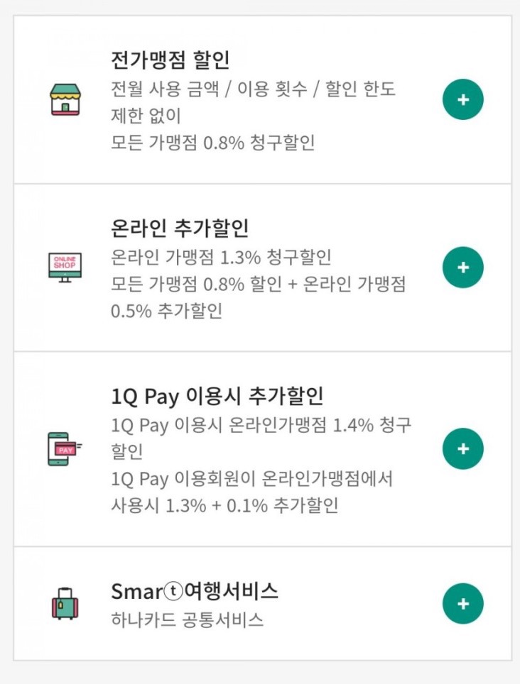- 온라인 대상 가맹점은 하나카드 가맹점분류상 해당 업종으로 등록된 가맹점에 한하며 제휴사 사정 등으로 해당 업종으로 등록되지 않은 경우 일부 추가 할인이 적용되지 않을 수 있다. 이 경우 고객센터(1800-1111)로 문의)