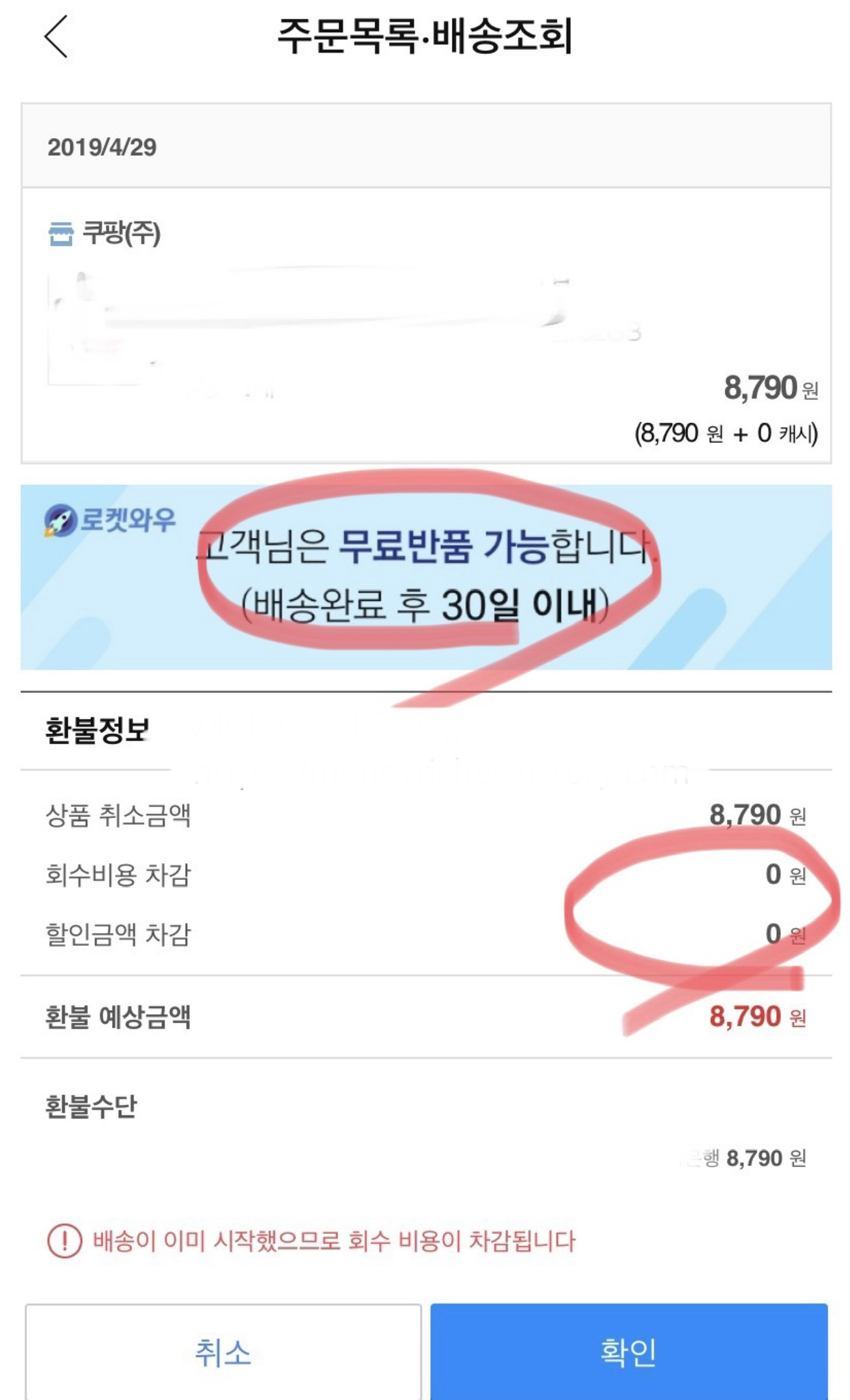하지만 로켓와우 멤버십에 가입되어 있지 아닐 경우에는 "회수비용차감"이 발생되는 듯하다.