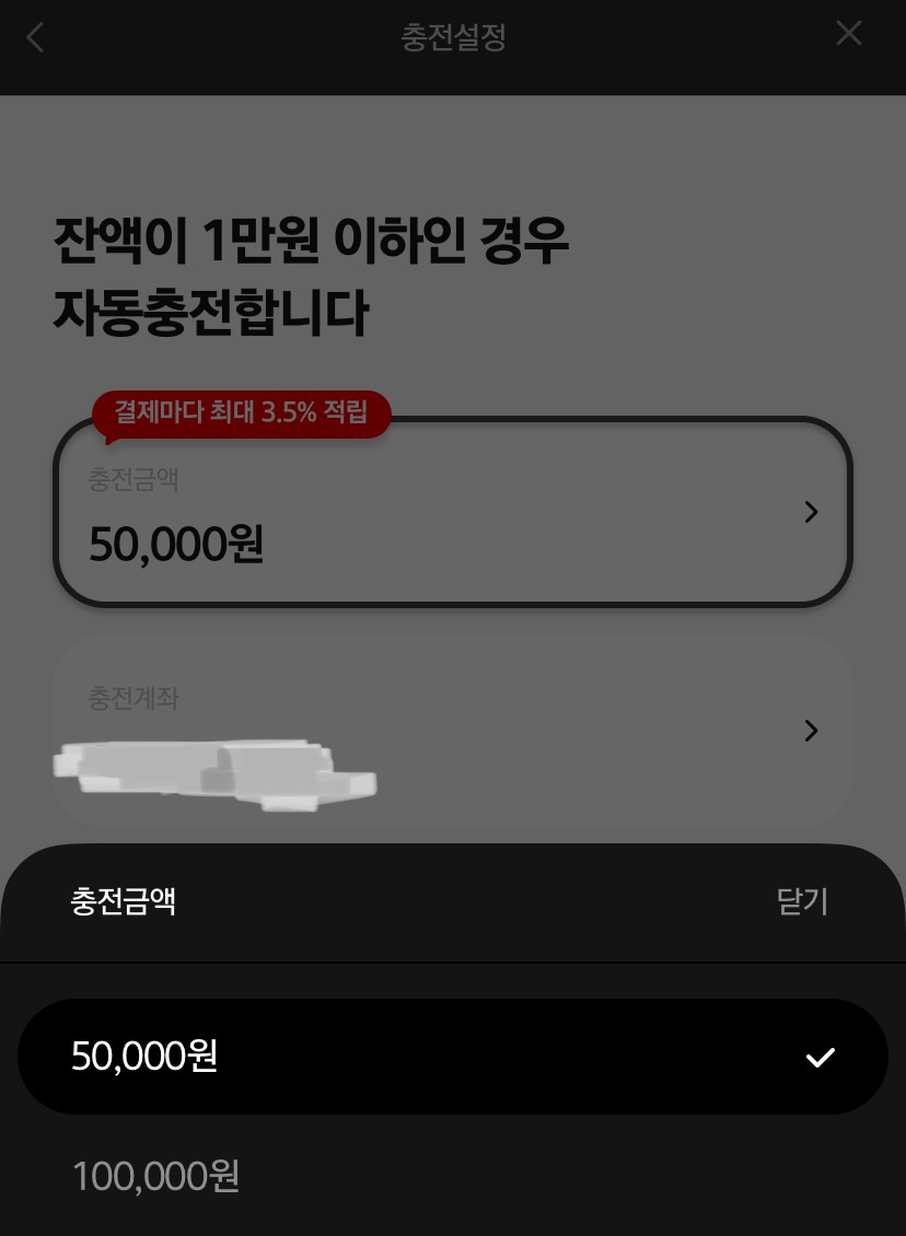 1. 차이 앱을 다운로드 및 회원가입 한 후 아래와 같이 자동충전 설정을 한다. (자동충전 시 8+2% 추가 적립 가능)