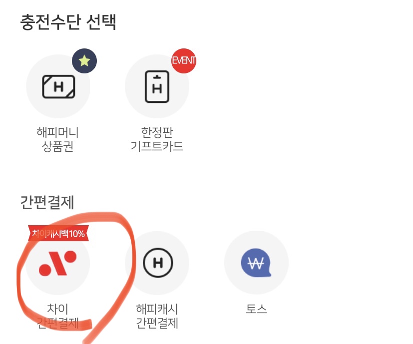 3. 해피머니 충전수단 중에 차이 간편결제를 선택한다.