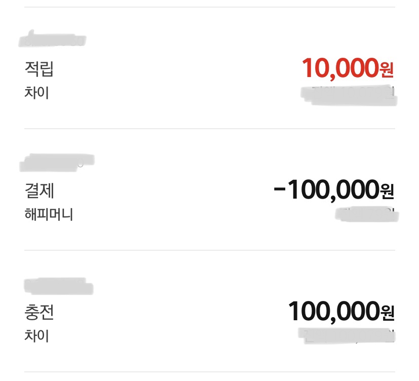 1회차 : 10만원 충전 / 10-0 = 10만원 인출 / 1만원 차이머니 적립 / 10만원 해피머니 / 누적 10만원 인출