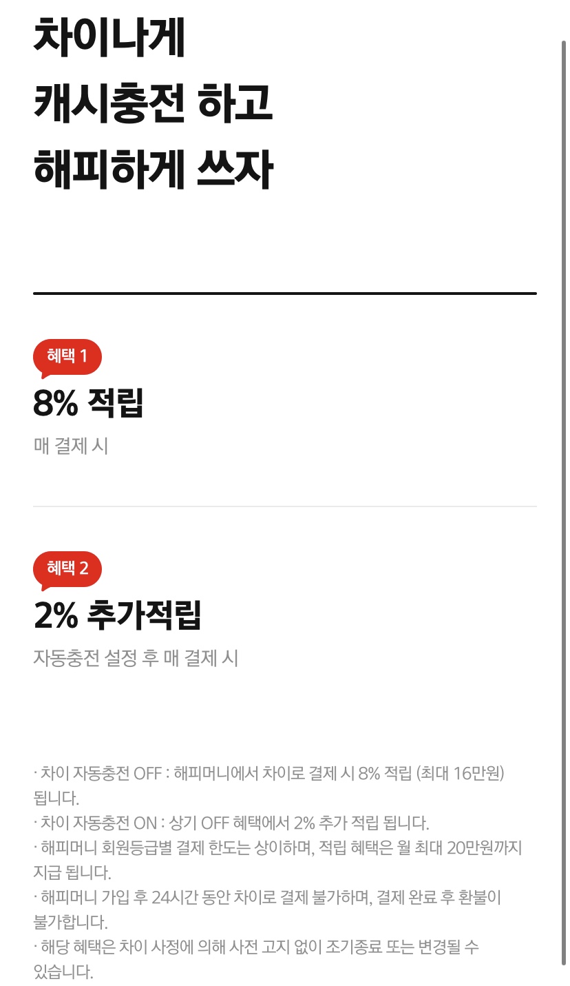 차이(간편결제)에서 아래와 같이 해피머니앱을 통해 해피캐시 구매 시 10% 할인 이벤트를 진행 중이다. 단 자동충전 설정을 해두어야 한다.