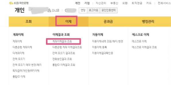 2. 상단 노란색 메뉴바 중에서 이체에 마우스 커서를 갖다 대면 하단에 "이체결과 조회"라는 메뉴가 있고 그 중에서 "계좌이체결과 조회"를 선택한다.