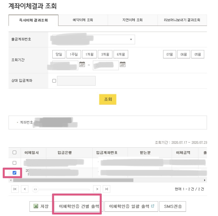 4. 마지막으로 나타난 리스트 중 아래와 같이 이체확인증이 필요한 내역을 선택하고