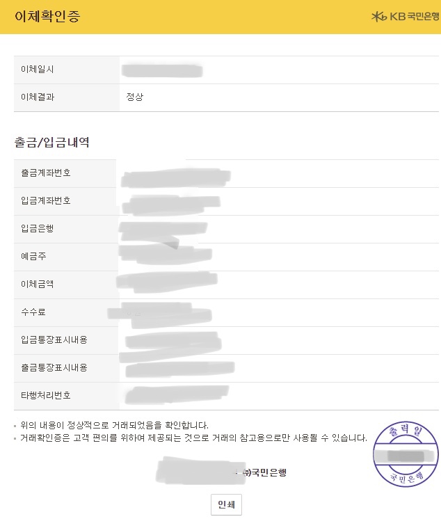 참고로 kb국민은행 이체확인증은 아래와 같은 서식이다.