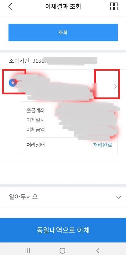 (4) 이체일시에 따른 조회기간을 설정하고 조회를 누른 후 먼저 왼쪽 옵션버튼 > 동그라미를 체크하여 파란색으로 채워주고 오른쪽 화살표 표시를 선택한다.